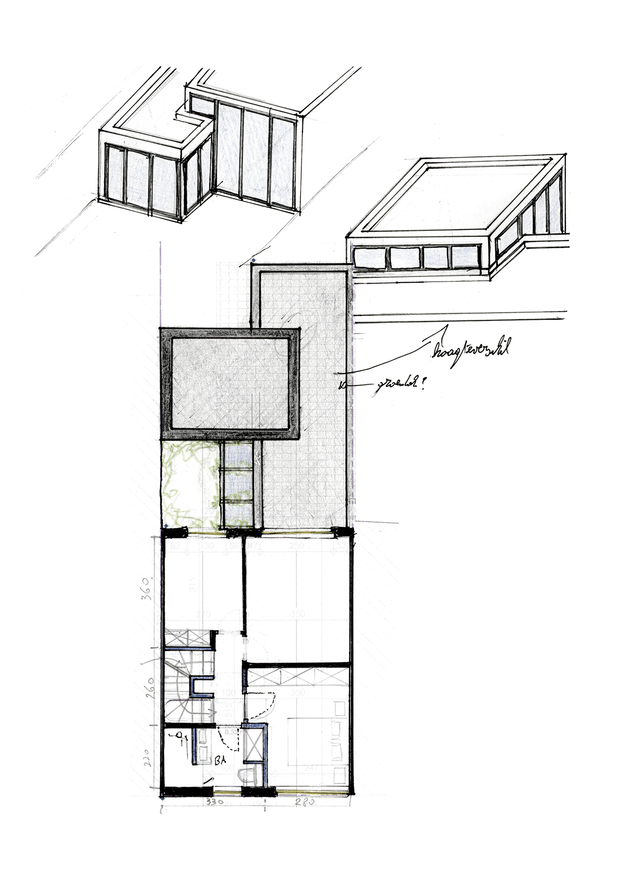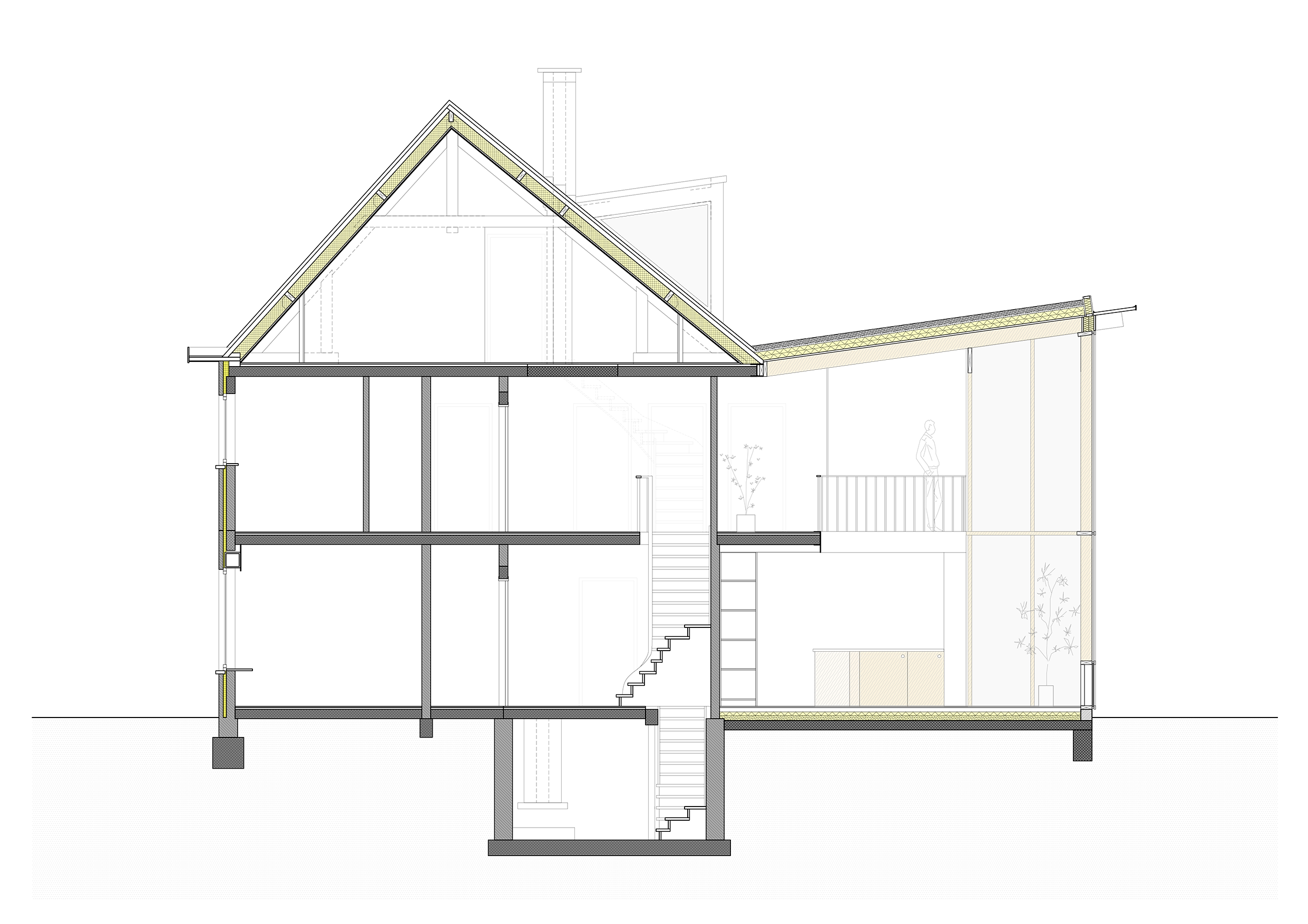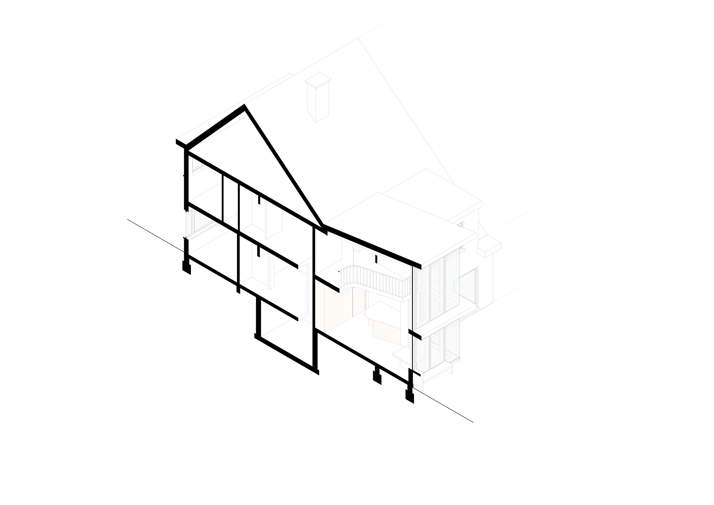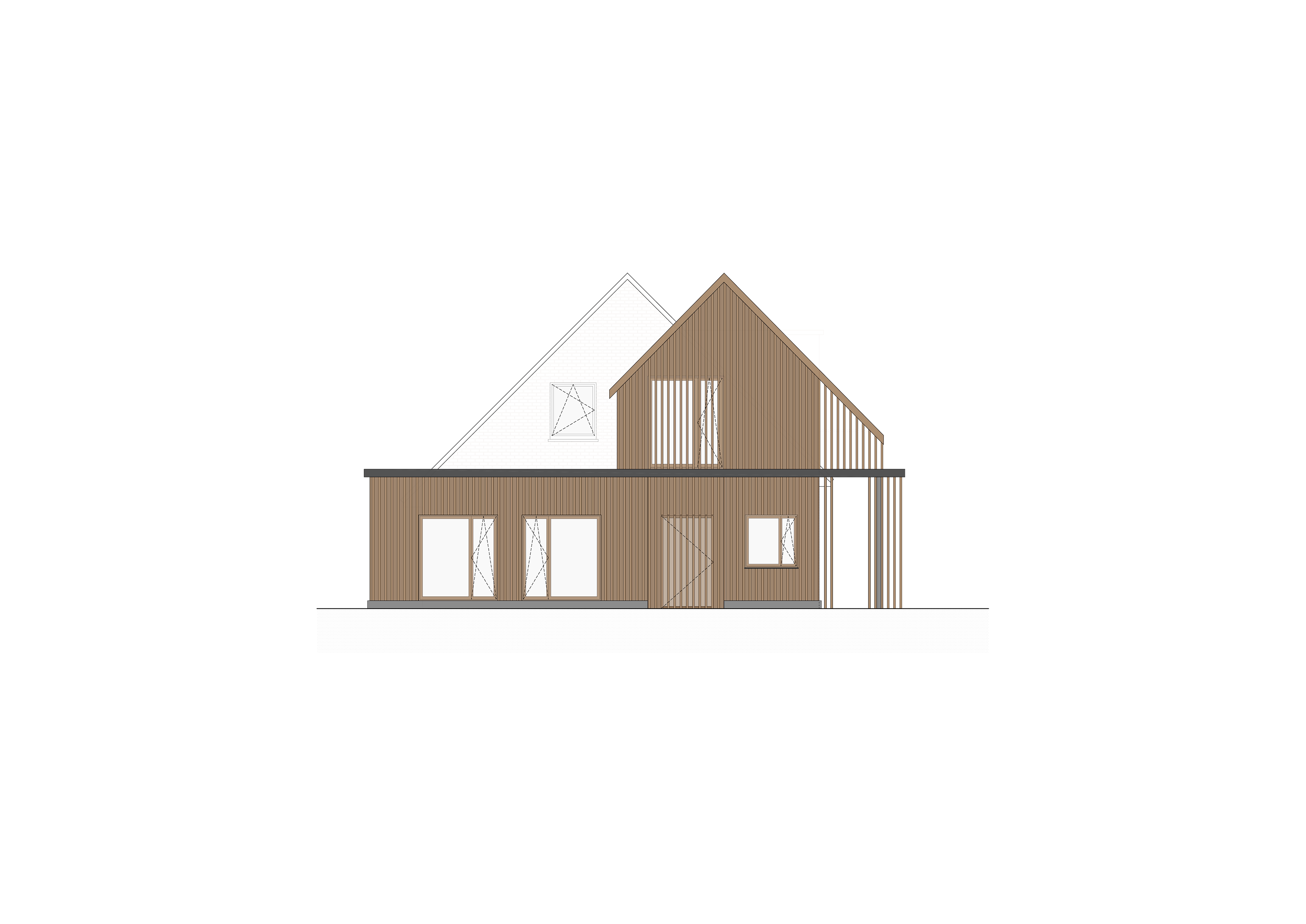 De bestaande achterbouw oogt vrij gesloten en wordt gesloopt. In de plaats daarvan komt een nieuwe uitbreiding met een groot nieuw schrijnwerkgeheel, dat licht en zicht tot diep in de woning brengt en de relatie met de groene tuinomgeving versterkt. Een gedeelte van de verdiepingsvloer wordt t.h.v. de nieuwe uitbouw zorgvuldig weggesneden om een vide te creëren, waardoor de donkere kern van de woning lichtrijker wordt en er verrassende visuele linken worden gecreëerd.