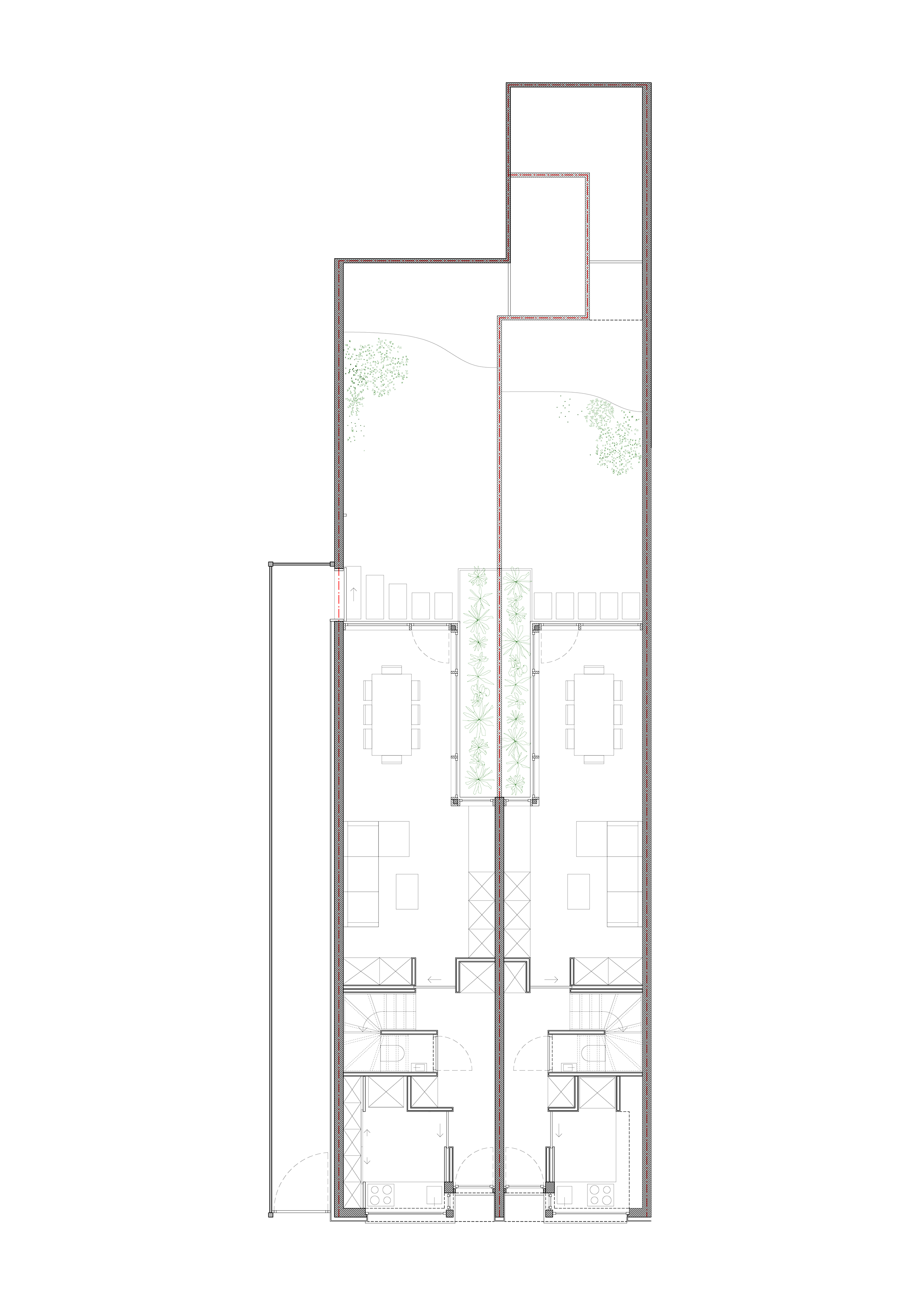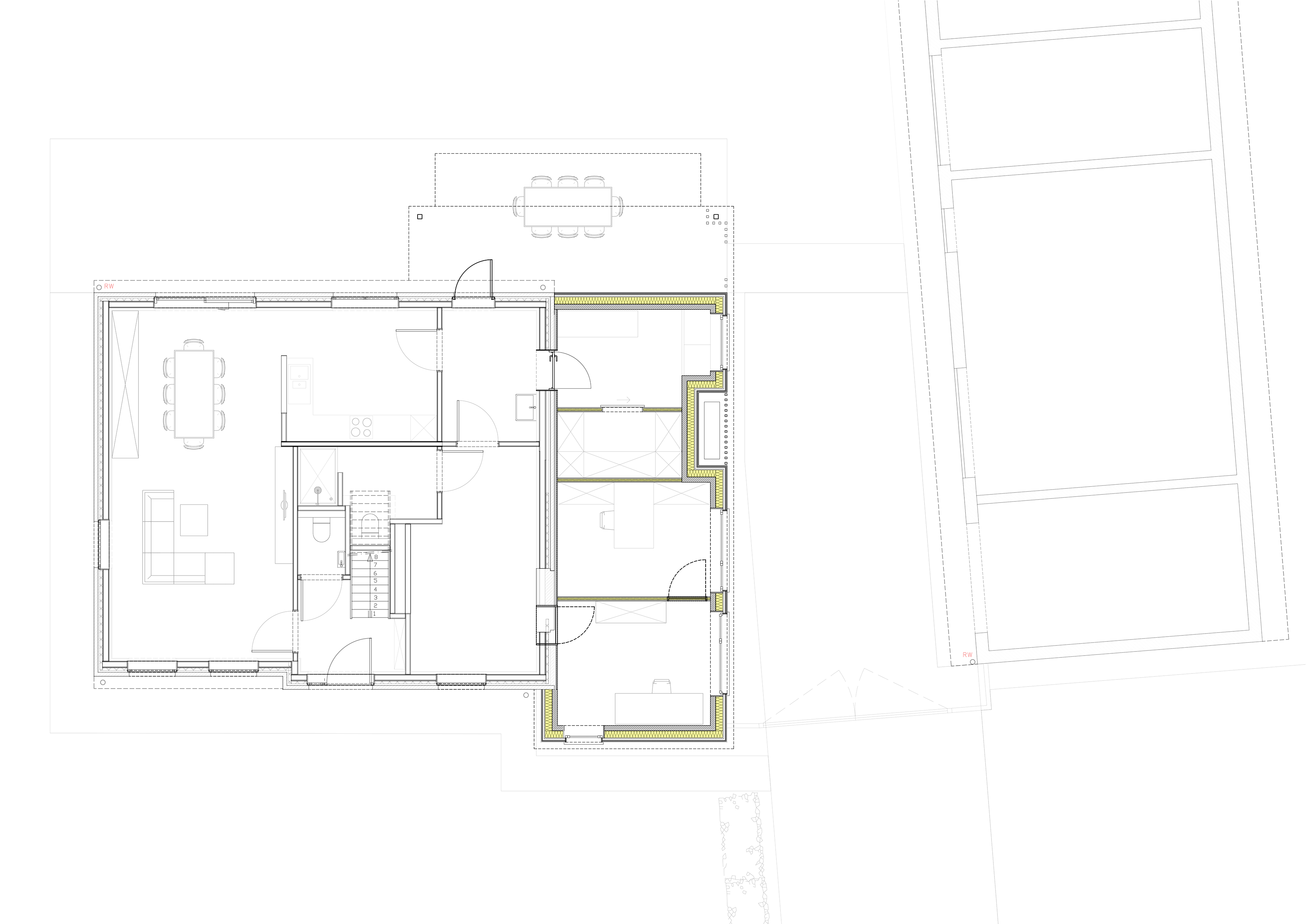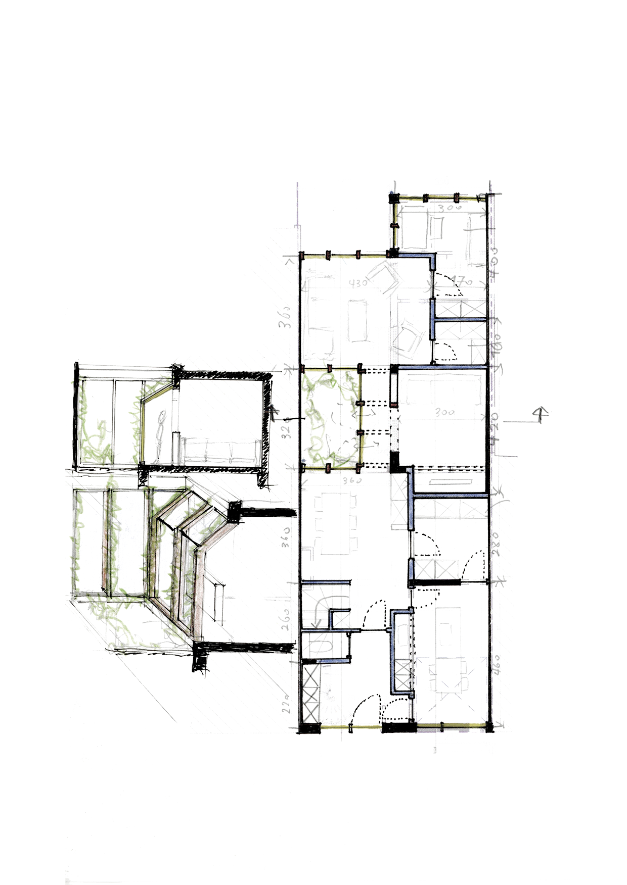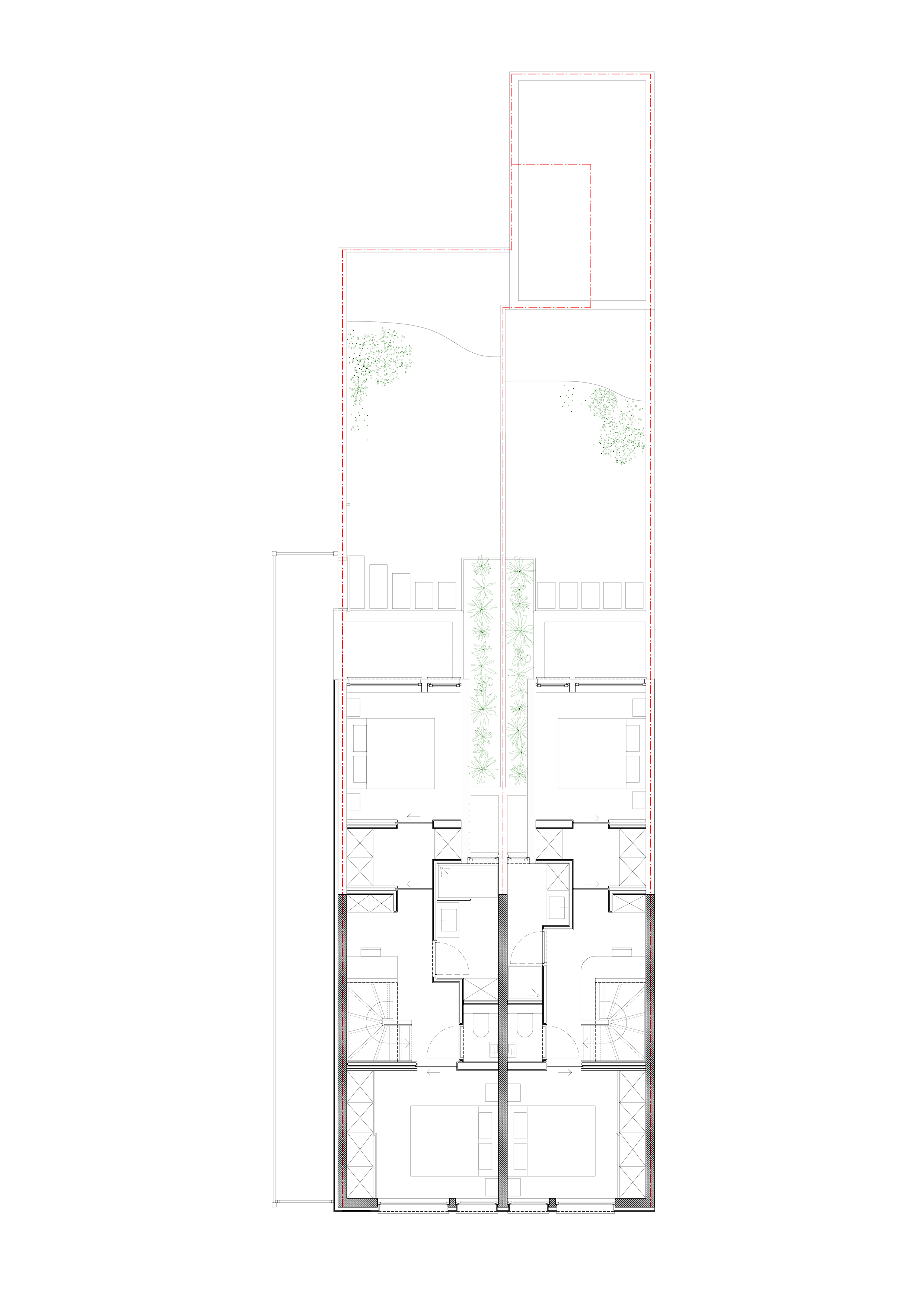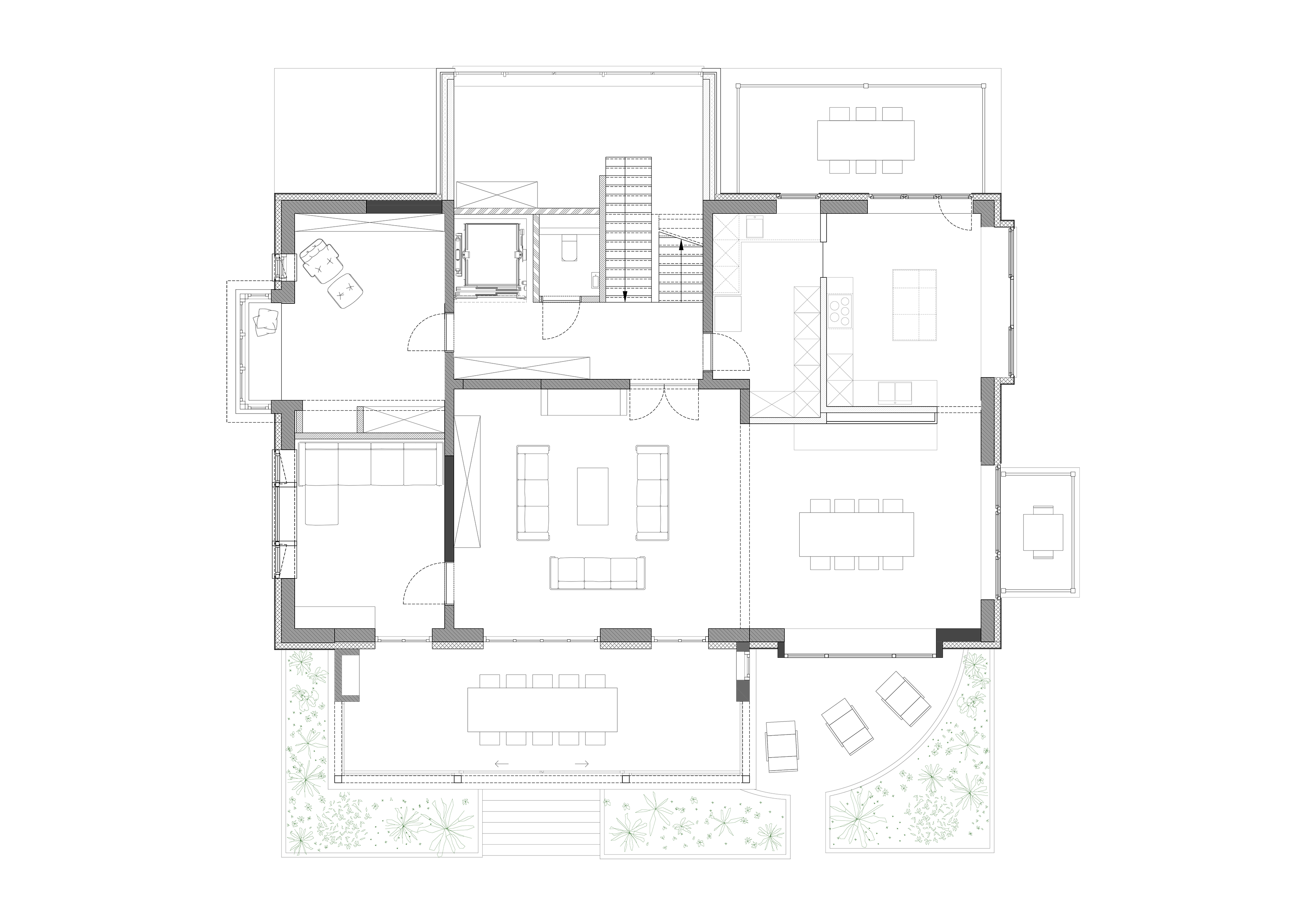 De bestaande achterbouw oogt vrij gesloten en wordt gesloopt. In de plaats daarvan komt een nieuwe uitbreiding met een groot nieuw schrijnwerkgeheel, dat licht en zicht tot diep in de woning brengt en de relatie met de groene tuinomgeving versterkt. Een gedeelte van de verdiepingsvloer wordt t.h.v. de nieuwe uitbouw zorgvuldig weggesneden om een vide te creëren, waardoor de donkere kern van de woning lichtrijker wordt en er verrassende visuele linken worden gecreëerd.