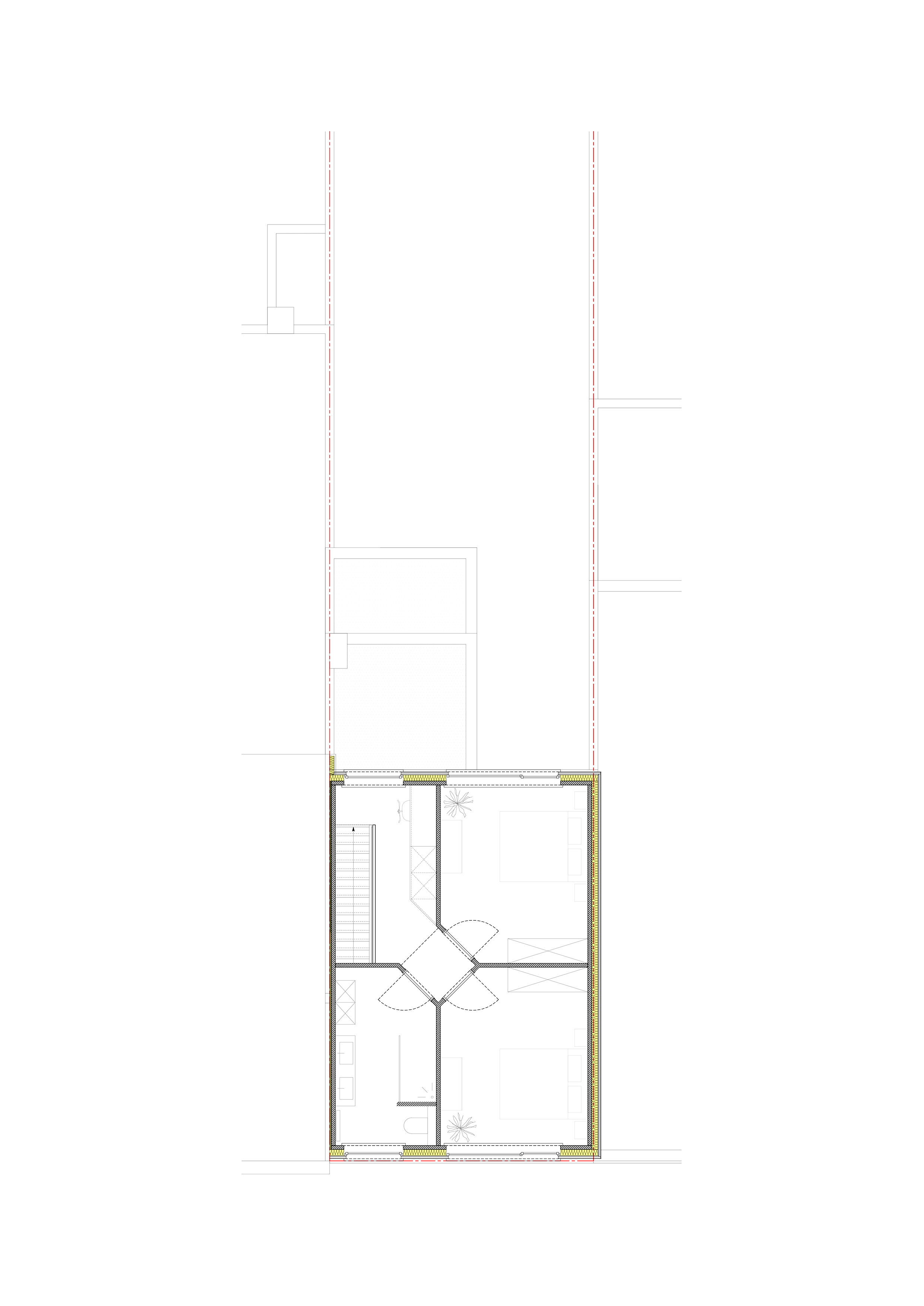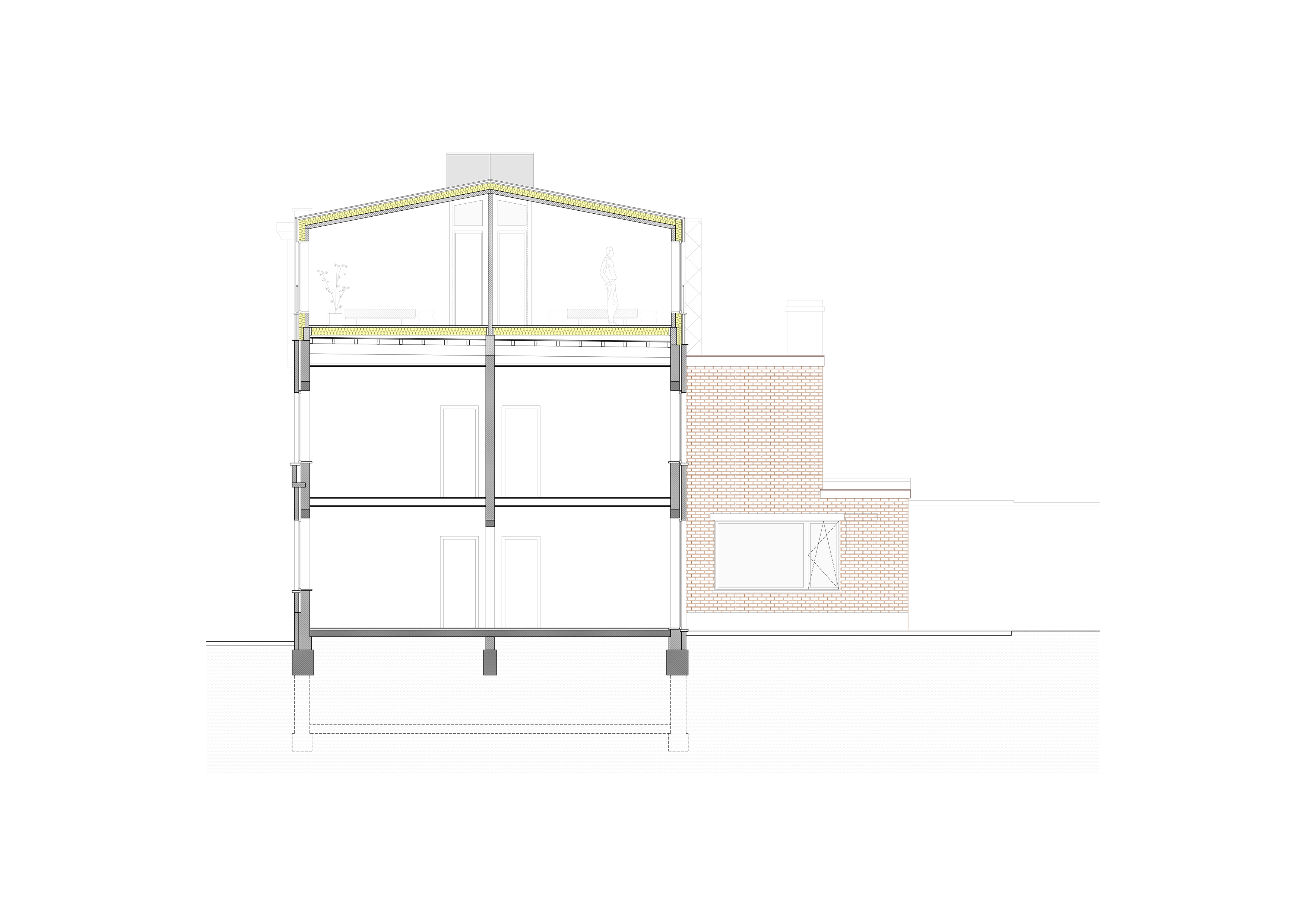 In de optopping wordt het ritme van de bestaande ramen overgenomen, zowel in de voor- als achtergevel. Er worden twee extra slaapkamers en een nieuwe badkamer ingericht. De nieuw volume krijgt een licht hellend dak om de ruimtelijke beleving van de ruimtes te optimaliseren. Er wordt een lichtkoker toegevoegd t.h.v. de nok om extra daglicht binnen te brengen in de overloop en de slaapkamers.